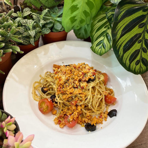 Spaghetti with minced chicken, chilli flakes, herbs & cheese tossed in oil.
